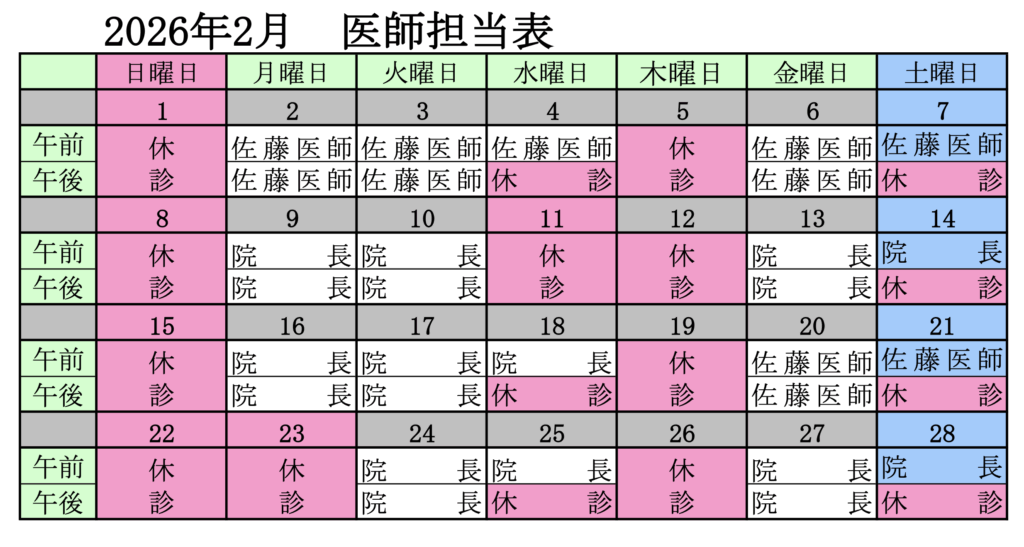 2月の診療日程、担当医師が確定しましたので、報告させていただきます。