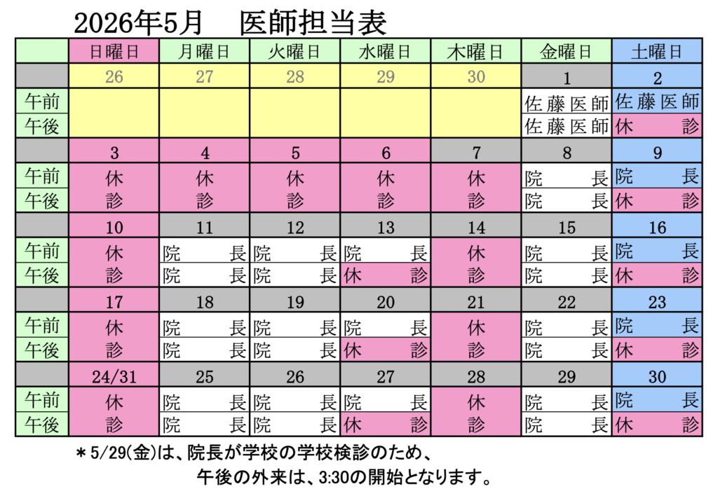 5月の診療日程、担当医師が確定しましたので、報告させていただきます。