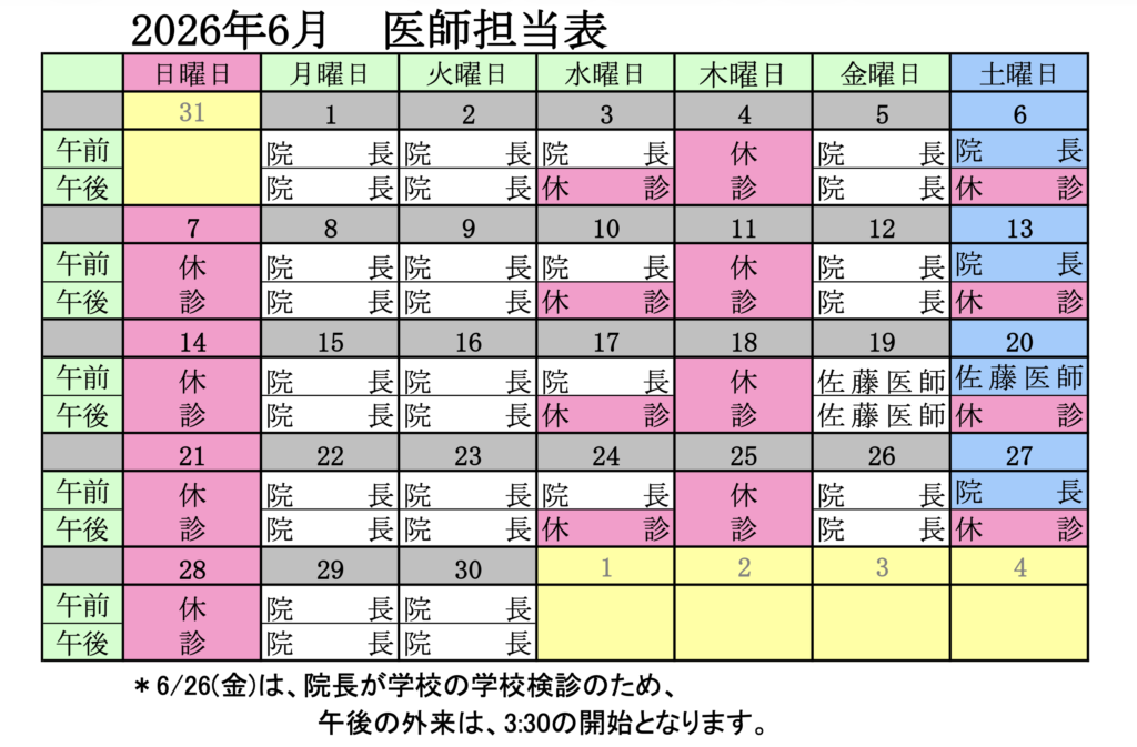 6月の診療日程、担当医師が確定しましたので、報告させていただきます。